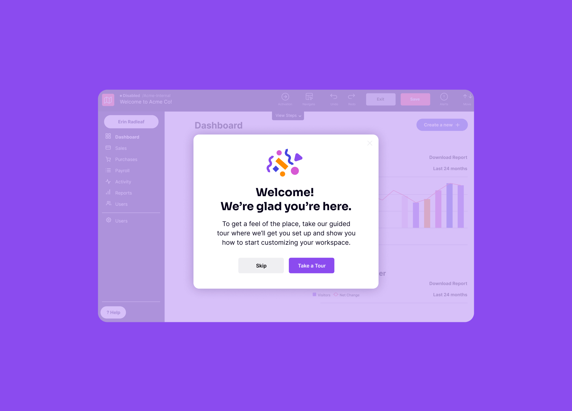 A drag-and-drop interface for creating interactive onboarding flows inside SaaS platforms to guide new users through product features and speed up activation.